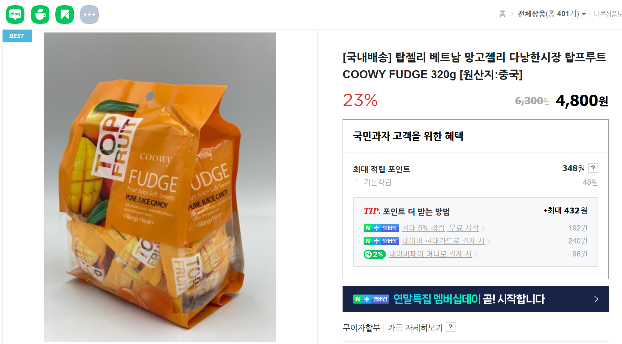 면세점에서 선물용으로 5달러짜리 망고젤리를 5개를 무겁게 들고 사 왔는데. 네이버에 보니 네이버가 훨씬 저렴하게 판매하고 있었다.